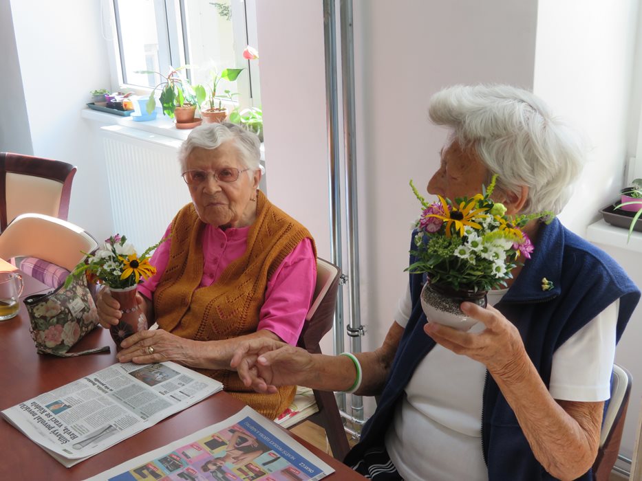 Po delší době k nám opět zavítala paní Lukasová, která doslova přinesla plou náruč květin. Přinesla s sebou i různé malé vázičky, konvičky, hrnky, a obyvatelé tak mohli společně s ní, vytvářet vlastní květinovou výzdobu, kterou si pak samozřejmě odnesli do svého bytu.