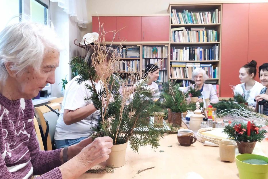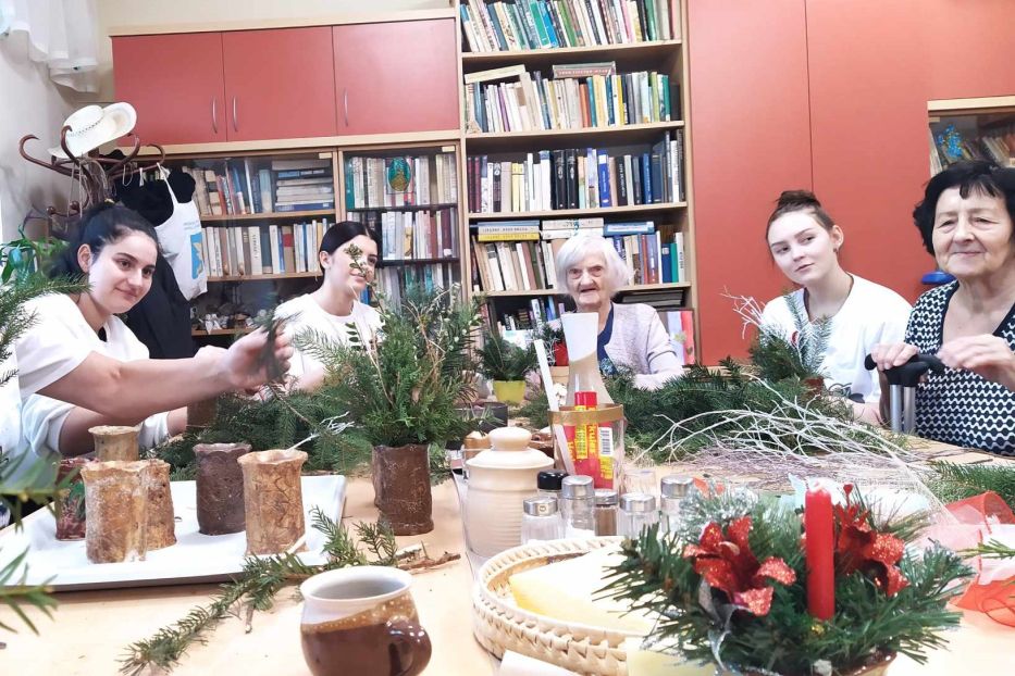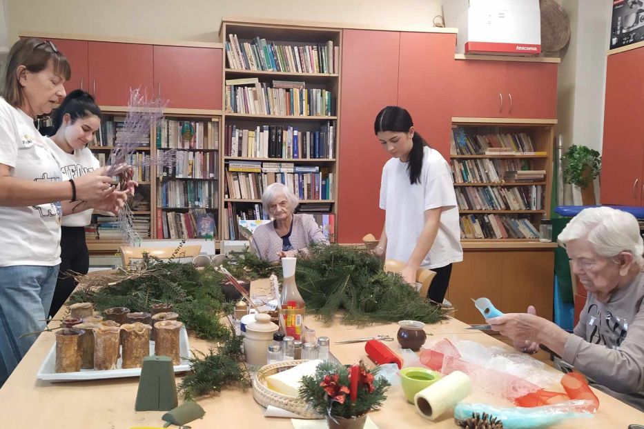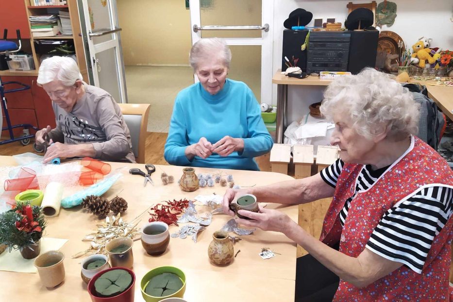 Společně se dvěma dobrovolnicemi jsme se pustily do výroby vánočních dekorací. Práce nám šla pěkně od ruky a podařilo se mám vytvořit krásné vánoční vazby a svícny, kterými si vyzdobíme společenskou místnost i jídelnu.