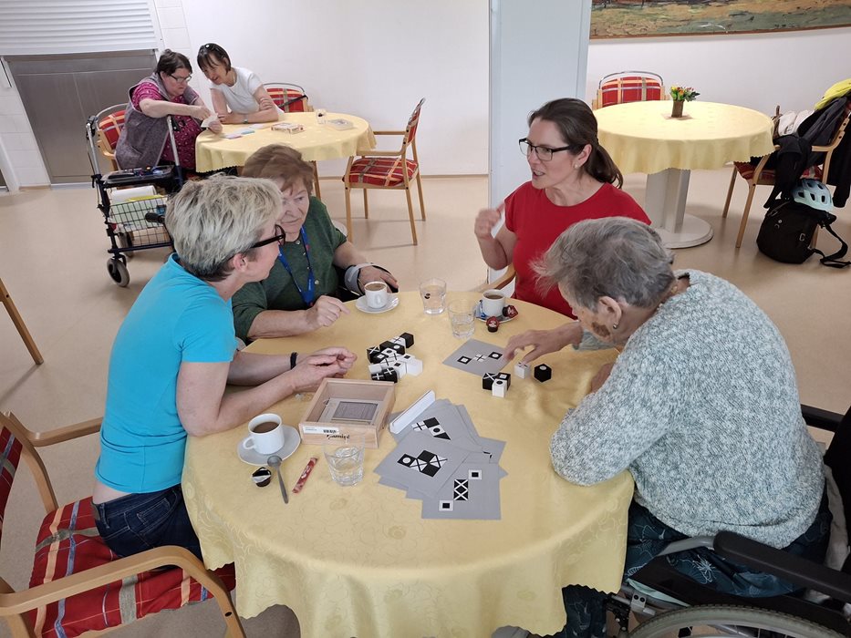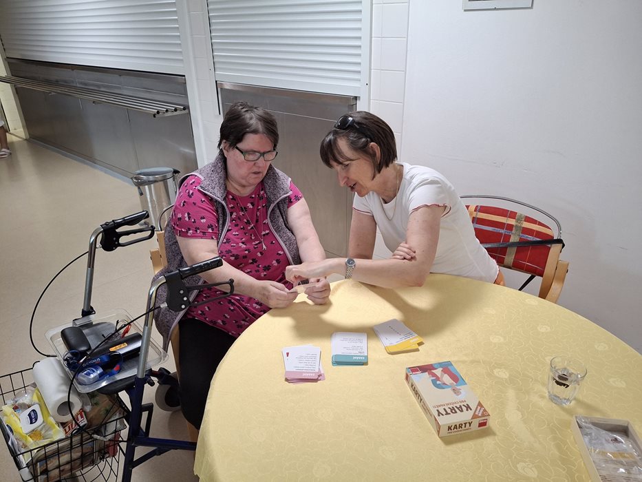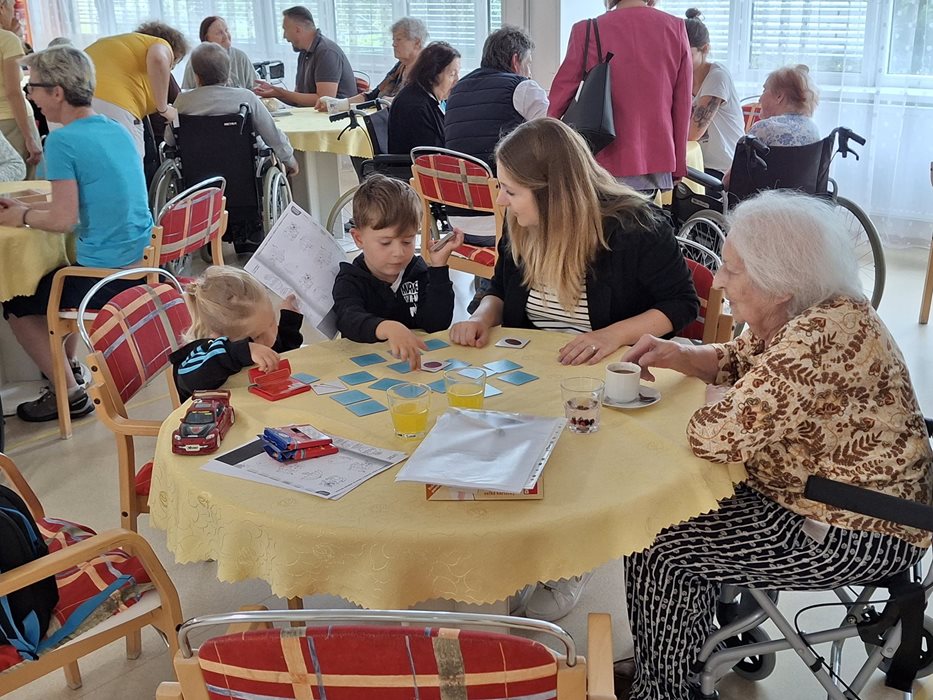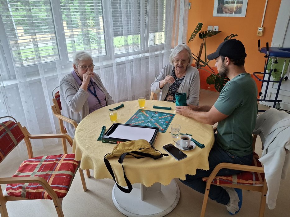 Plánované odpoledne se zmrzlinou v nedaleké cukrárně nám sice překazilo počasí, ale náladu nám to rozhodně nezkazilo. Společně s dobrovolníky z firmy Atlas Copco a organizace ADRA jsme si připravili náhradní program přímo v domově. Užili jsme si společenské hry, spoustu smíchu a dobré nálady. Nechyběla ani sladká tečka - zmrzlina s ovocem a šlehačkou, která všem zpříjemnila odpoledne. Děkujeme dobrovolníkům za milou návštěvu a těšíme se na další společná setkání.