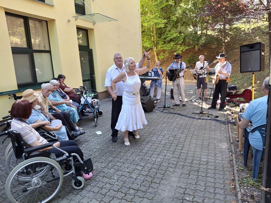 V našem domově jsme si užili hudební odpoledne se skupinou Ranch Country, kterou doprovázel taneční pár. K příjemné atmosféře přispěla vůně i chuť grilovaných klobásek, na kterých si všichni pochutnali. Akce byla plná radosti, hudby a dobrého jídla, a všichni na ni budeme dlouho vzpomínat.